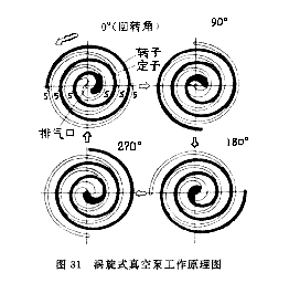 渦旋式無油真空泵是兩條漸開線螺旋曲線盤構成,即一個靜渦旋盤和一個動渦旋盤。動渦旋盤作偏心安裝,靜渦旋盤與動渦旋盤便形成月芽形腔體。隨著動渦旋盤轉動,月芽形腔體不斷向里旋轉壓縮,最后從中間排出至出氣口。動渦旋盤連續運轉,氣體不斷從進氣口吸入、壓縮,由出氣口排出,形成真空。